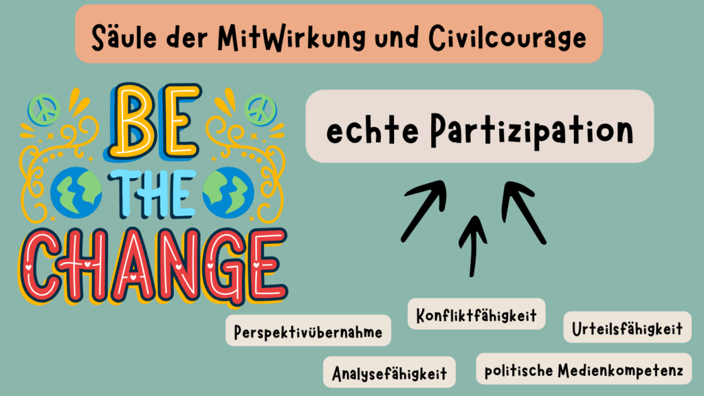 Außerdem sollen sie befähigt und darin bestärkt werden, für sich selbst und demokratische Rechte und Werte einzustehen und sich couragiert für andere einzusetzen.